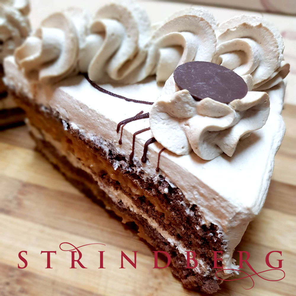 Bizcocho de chocolate con remojo de café, relleno de crema chantillí sin azúcar con café y pastelera sin azúcar con café.